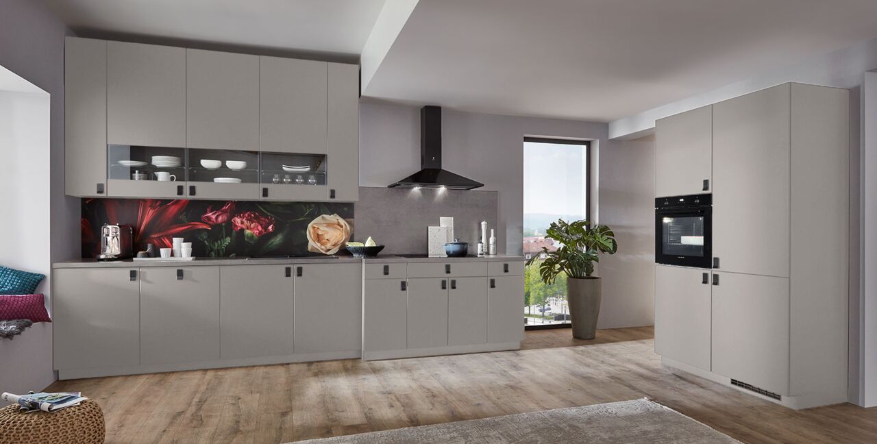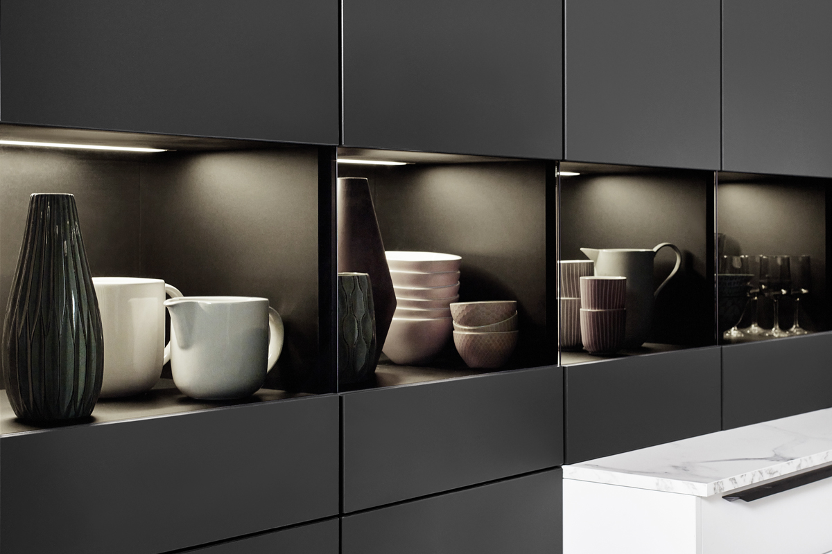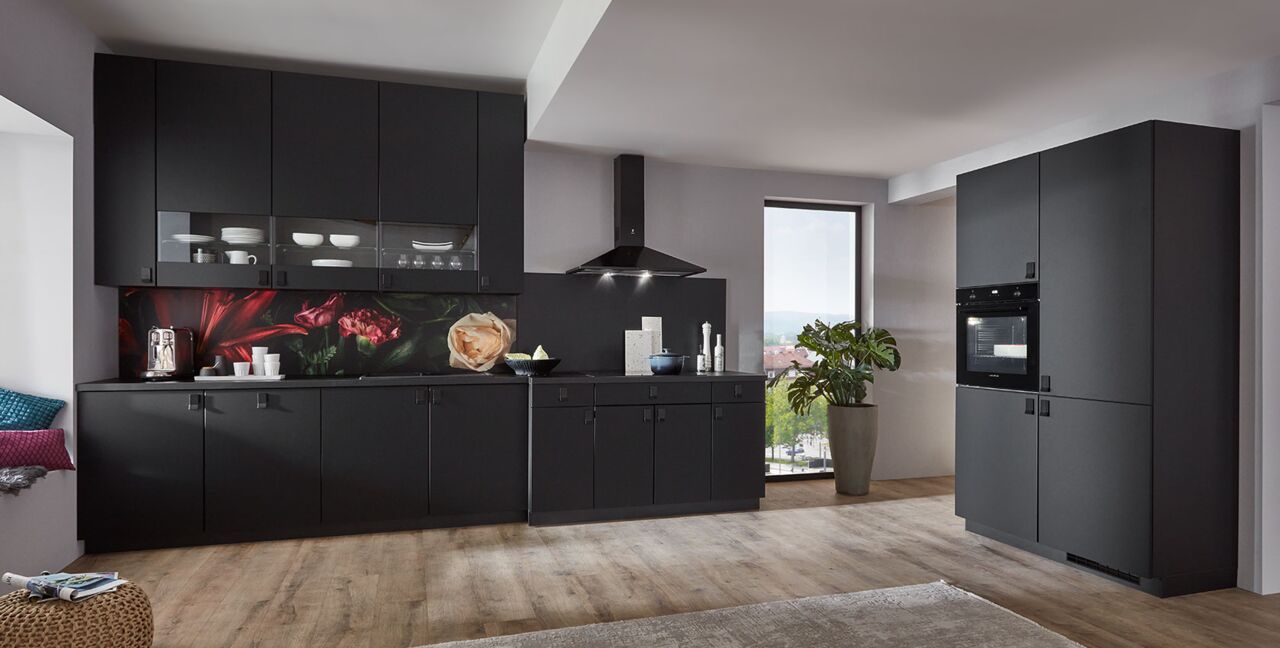 Inklusive Einbaubackofen Laurus LEB10BK Energieeffizienzklasse A, Glaskeramik Kochfeld Laurus LCA600, Dunstesse Schwarz Elica MISSY BL90-D Energieeffizienzklasse D, Kühlschrank Laurus LKG122E Energieeffizienzklasse E, Einbau-Designspüle Elleci Logik 300, XL-Schränken, Wandschrank mit Segmentglastüren.