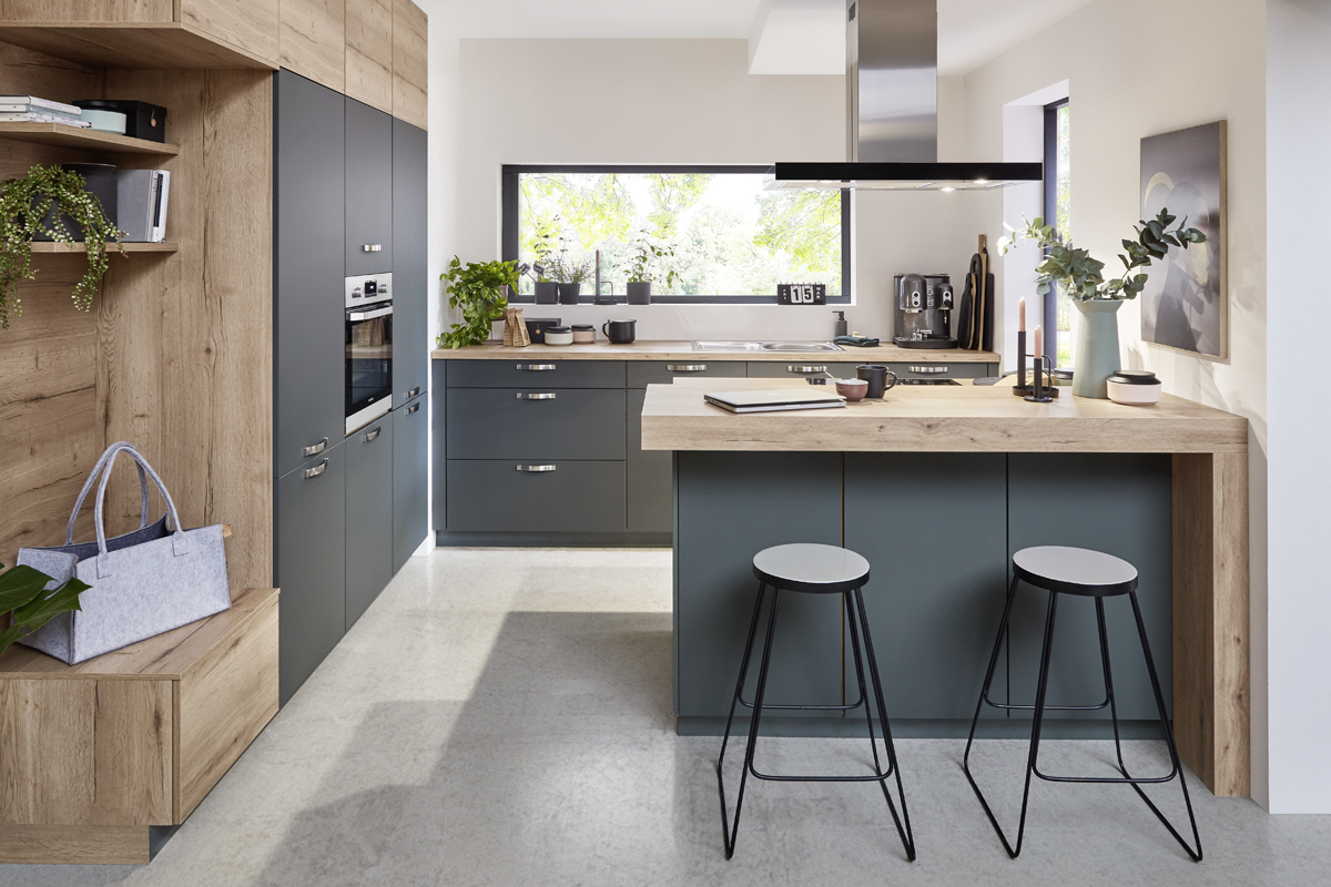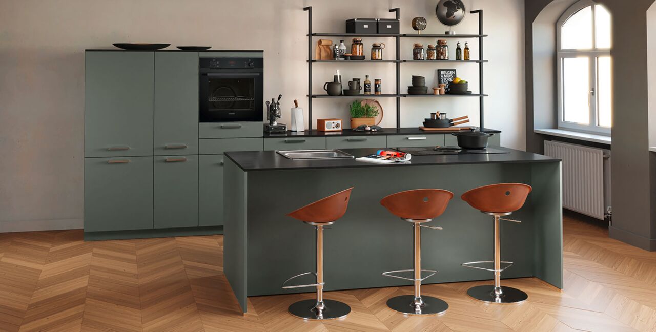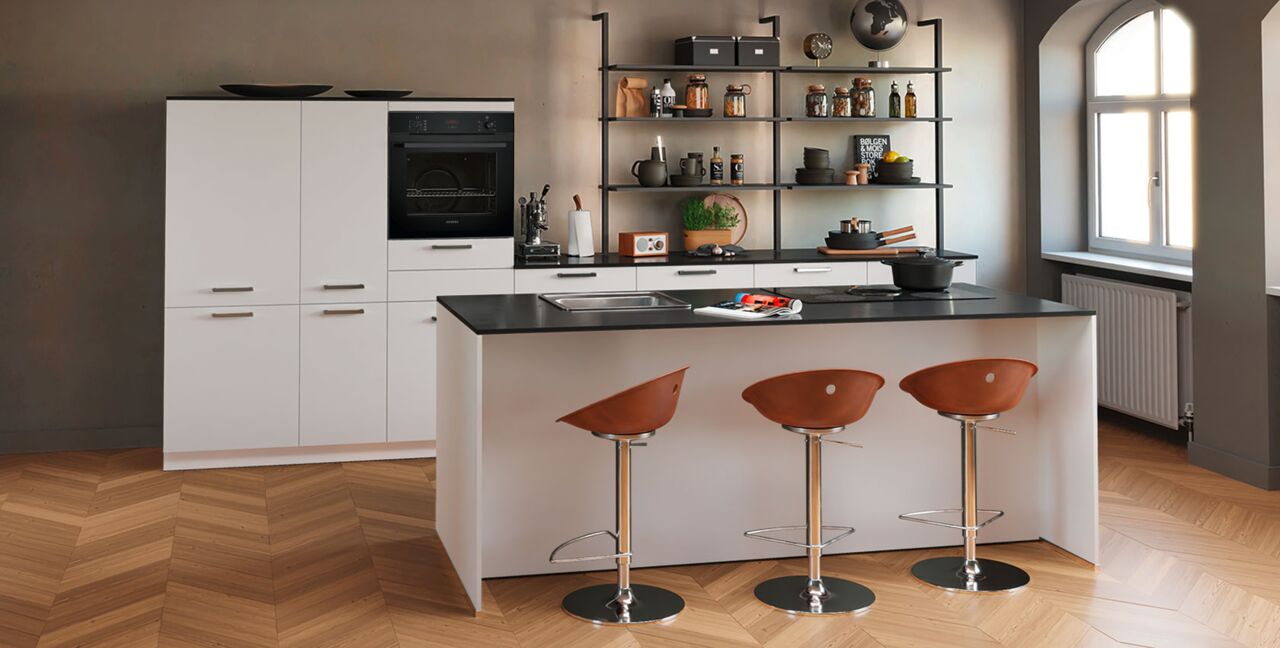 Inklusive Einbaubackofen schwarz Bosch HBA272BB3 Energieeffizienzklasse A+, Glaskeramik Kochfeld mit Induktion und Kochfeldabzug (Umluft) Bora GPNextE80N, Kühlschrank Laurus LKG88E Energieeffizienzklasse E, Geschirrspüler vollintegriert Bosch SBV2HTX08E Energieeffizienzklasse C, Einbauspüle Edelstahl Rodi NewManaus, Geschirrschrank, Stollenregalsystem, Esstheke, XL-Schränken.