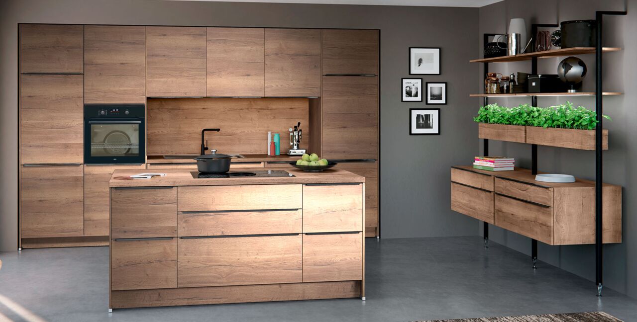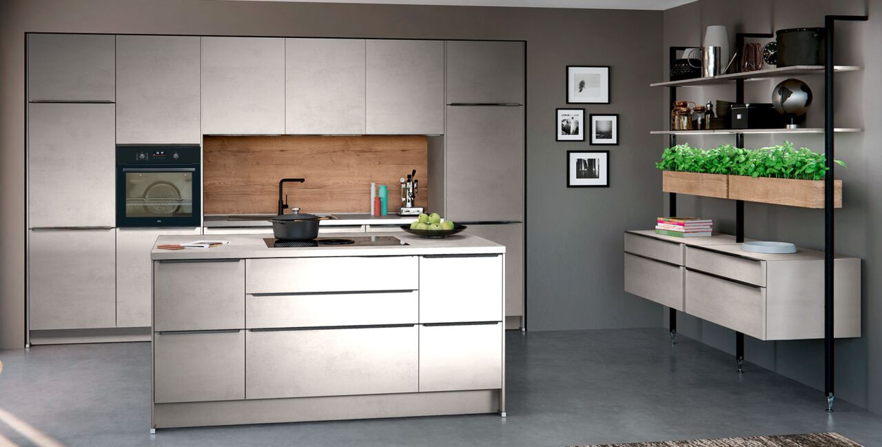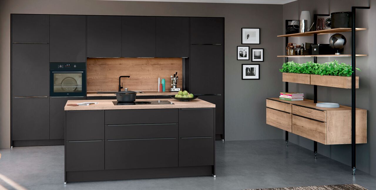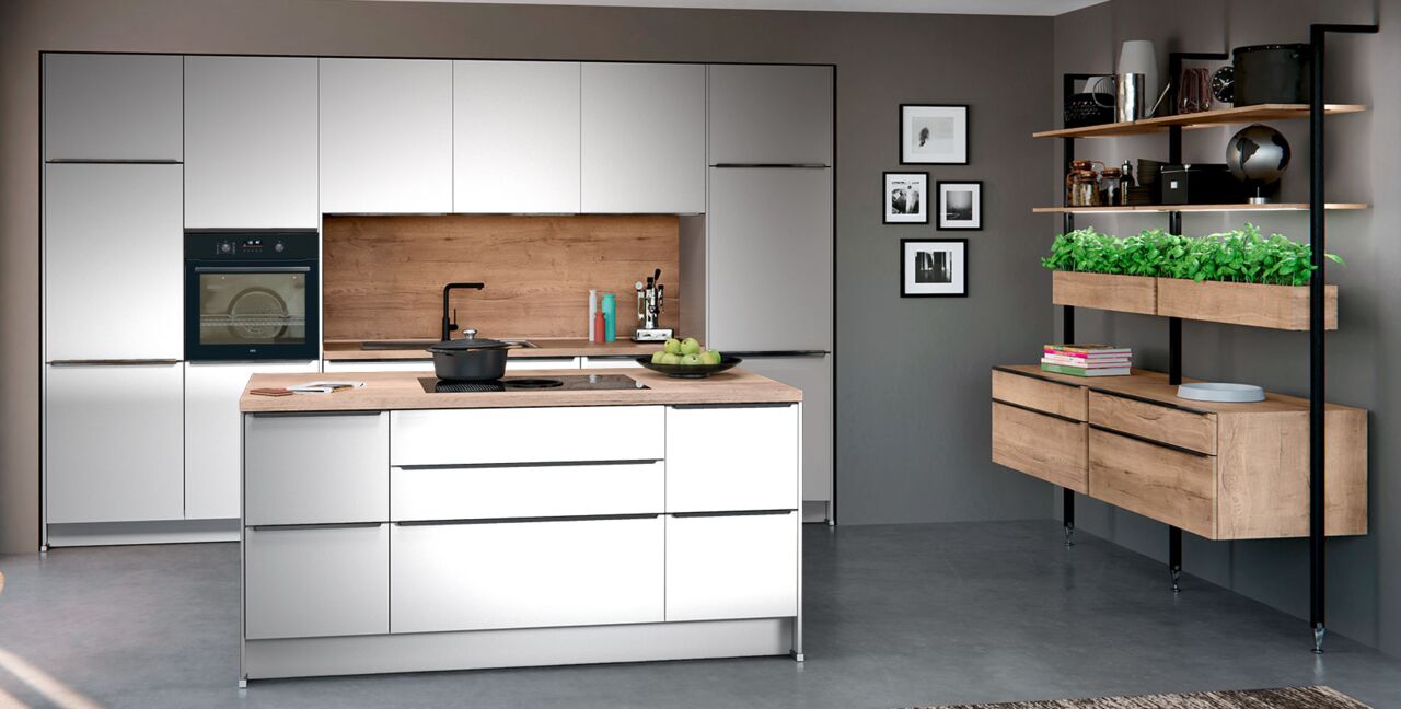 Inklusive Einbaubackofen AEG EB32B Energieeffizienzklasse A, Glaskeramik Kochfeld mit Induktion und Kochfeldabzug (Umluft) Bora GPNextE80N, Kühlschrank AEG OSK6I82EF Energieeffizienzklasse E, Geschirrspüler vollintegriert Bosch SMV41D10EU Energieeffizienzklasse E, Einbauspüle Edelstahl Rodi Okio Line 85 Deep, Stollenregalsystem, Unterschränken mit Großraumauszügen.