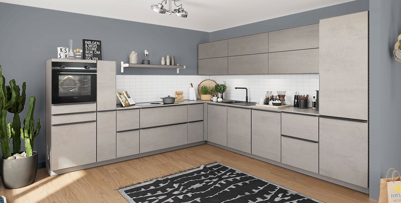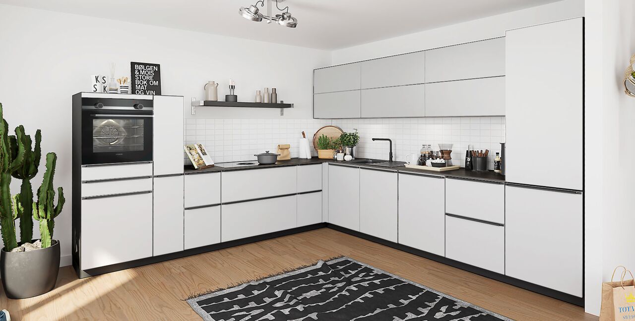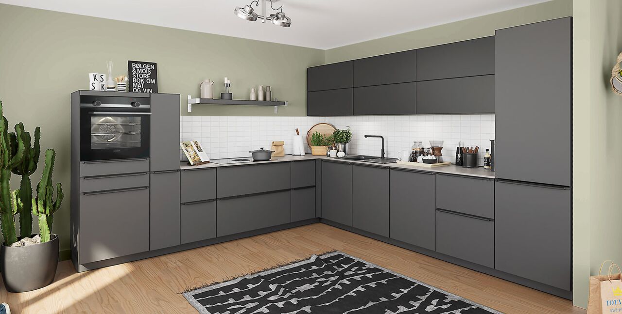Inklusive Einbaubackofen in Schwarz mit Multifunktion AEG BEE43511AB Energieeffizienzklasse A, Glaskeramik Kochfeld mit Induktion und Kochfeldabzug (Umluft) Bora GPNextE80N, Kühlschrank AEG EKS123E Energieeffizienzklasse E, Geschirrspüler vollintegriert Bosch SMV41D10EU Energieeffizienzklasse E, Einbau-Designspüle Elleci Logik 300, XL-Schränken, Unterschränken mit Großraumauszügen, Wandschränken mit Falt-Lifttür, Apothekerschrank.