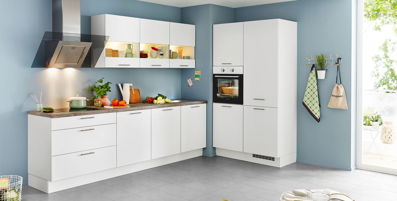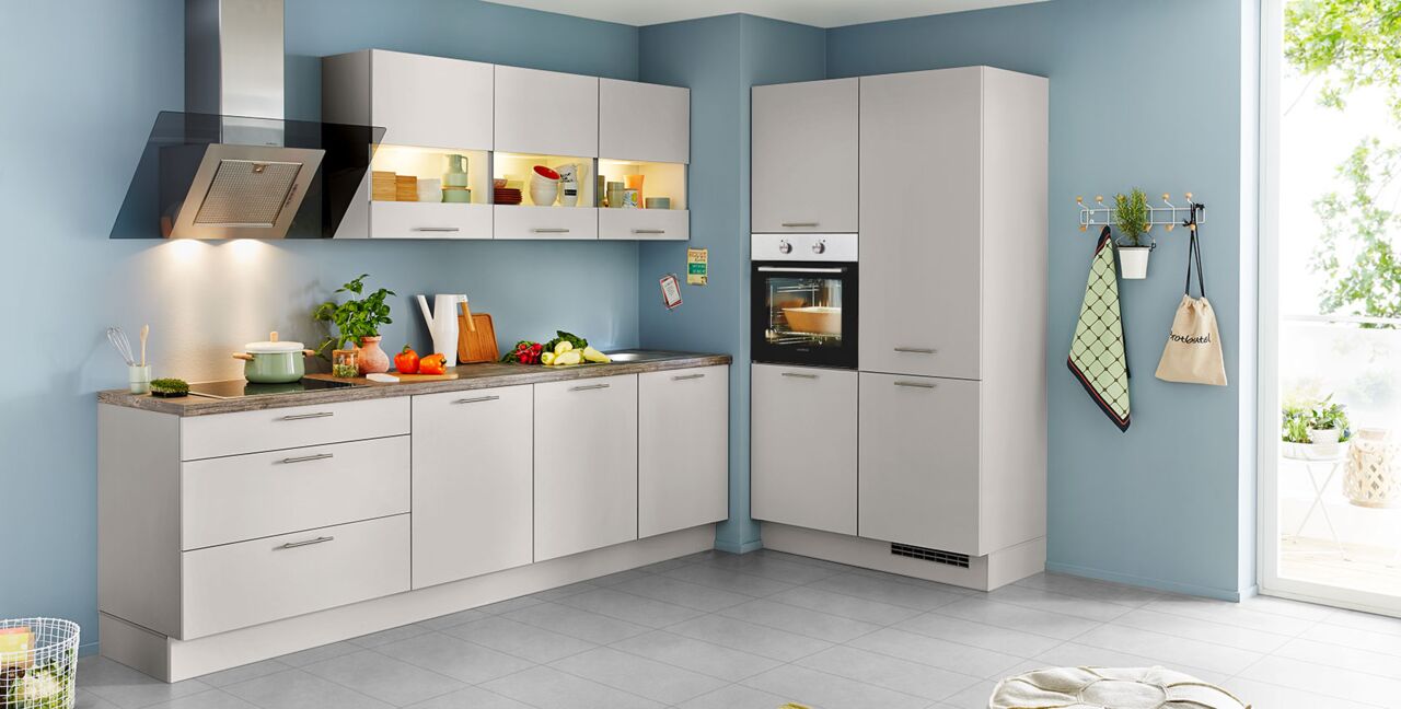 Inklusive Einbaubackofen Edelstahl Laurus LEB3 Energieeffizienzklasse A, Glaskeramik Kochfeld Laurus LCA600, Designesse Edelstahl / Schwarzglas Airforce F134-90 S4 BK Energieeffizienzklasse C, Kühlschrank Laurus LKG88E Energieeffizienzklasse E, Einbauspüle Edelstahl Rodi Okio Line 85 Deep, Unterschrank mit Frontauszügen, Wandschränken mit Segmentglastür.