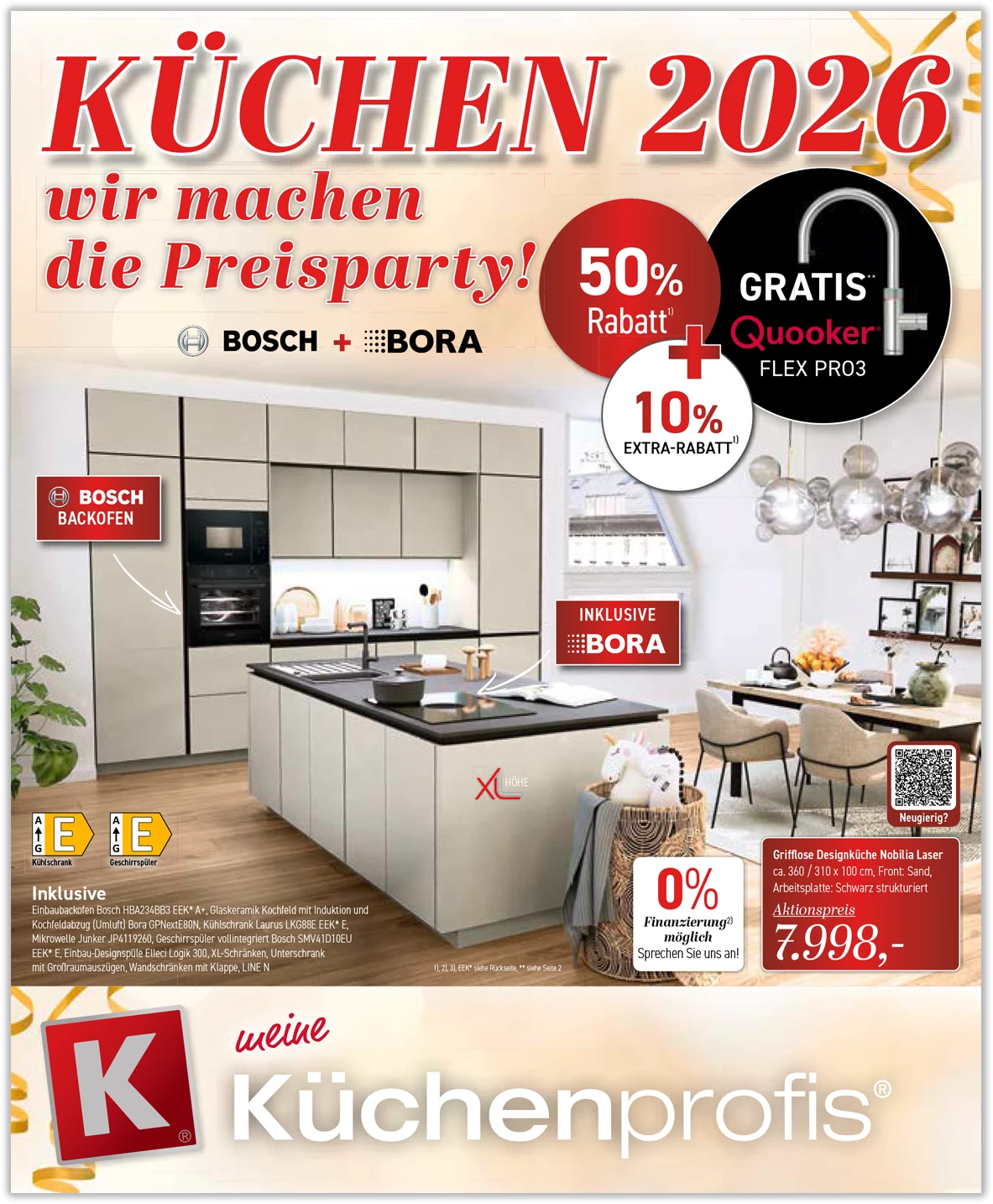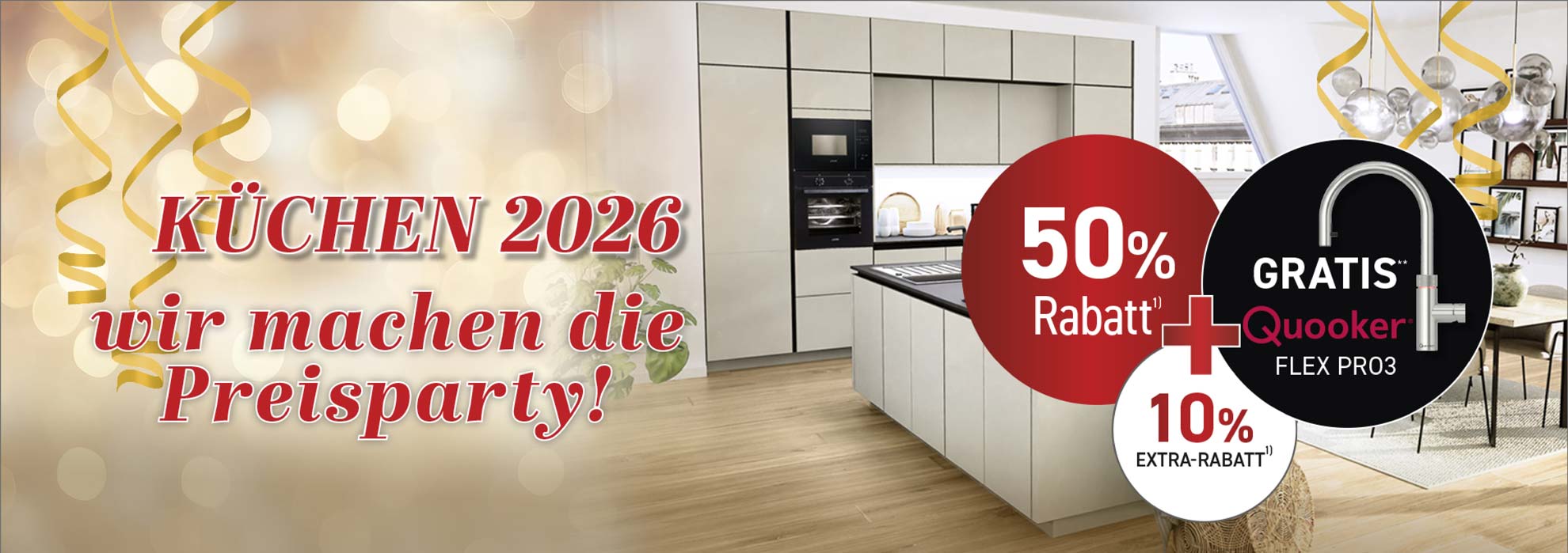 ** Gratis Quooker Flex Pro3 im Wert von 1395 € in verchromt glänzend, ohne Cube. Nur bei frei geplanten Küchen ab 9.900 € Auftragswert. Nur bei Neuaufträgen. Keine Barauszahlung. 1) Gültig nur für Neuaufträge. Bei allen in Anzeigen, Mailings und Prospekten angegebenen Preisen sind bereits sämtliche Nachlässe berücksichtigt.