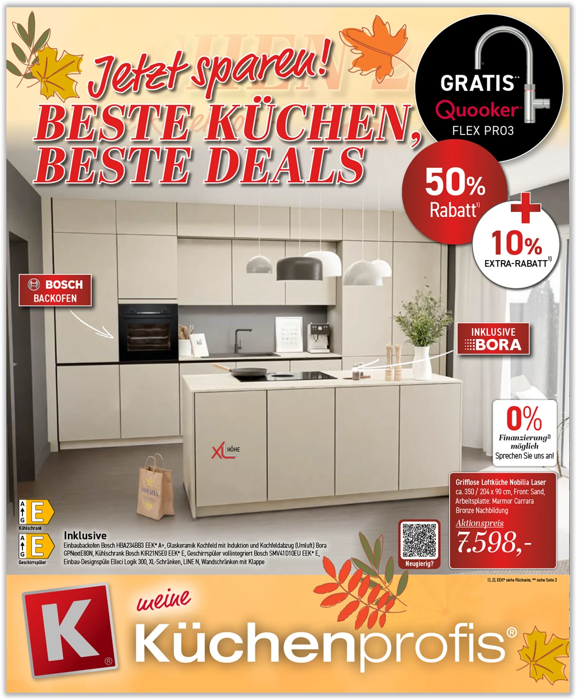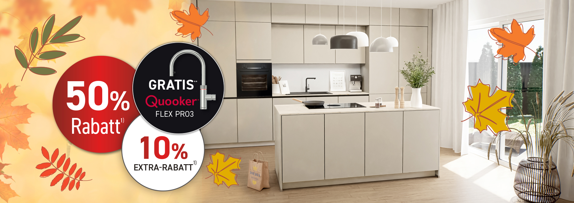 **Gratis Quooker Flex Pro3 im Wert von 1395 € in verchromt glänzend, ohne Cube. Nur bei frei geplanten Küchen ab 9.900 € Auftragswert. Nur bei Neuaufträgen. Keine Barauszahlung möglich. Nur bei frei geplanten Küchen ab 9.900 € Auftragswert. Nur bei Neuaufträgen. Keine Barauszahlung. 1) Gültig nur für Neuaufträge. Bei allen in Anzeigen, Mailings und Prospekten angegebenen Preisen sind bereits sämtliche Nachlässe berücksichtigt. Alle Preise sind Abholpreise. Alle Preise ohne Armatur, Beleuchtung, Zubehör, Nischenausstattung und Dekoration. Modell-, Farb- u. Maßabweichungen sowie Preisirrtümer und Liefermöglichkeiten sind vorbehalten. Alle Maße sind ca.-Angaben. Verkauf solange der Vorrat reicht.