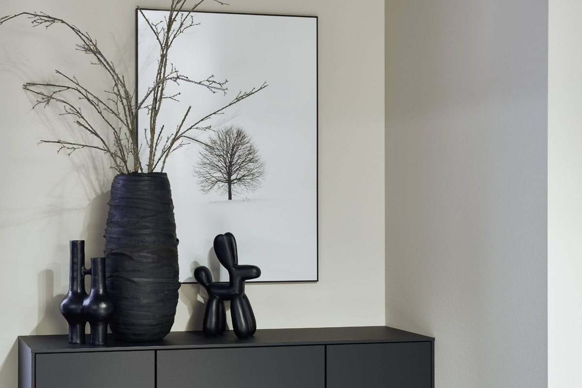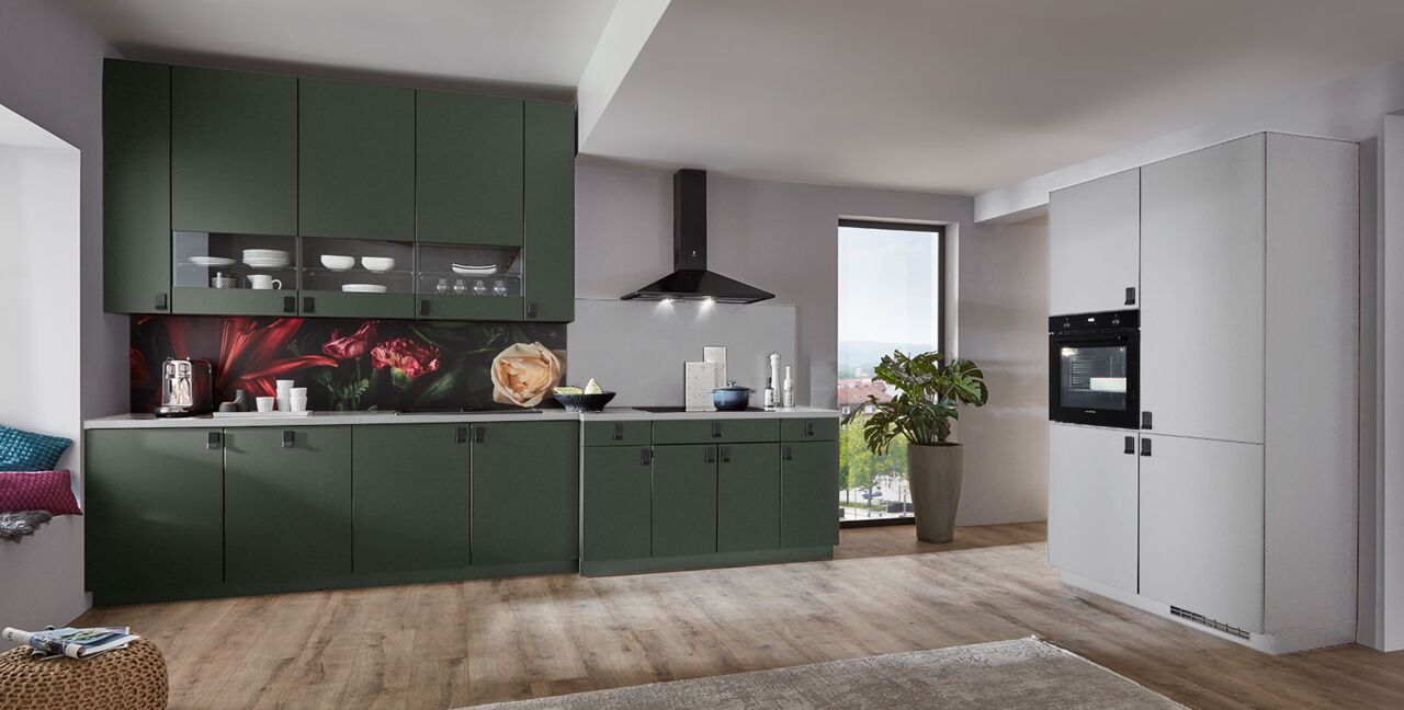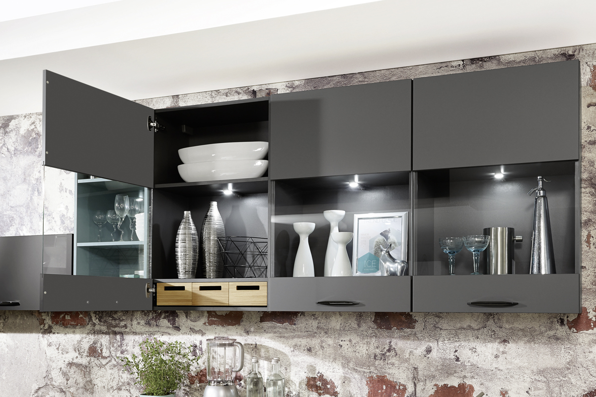Inklusive Einbaubackofen Laurus LEB10BK Energieeffizienzklasse A, Glaskeramik Kochfeld Laurus LCA600, Dunstesse Schwarz Elica MISSY BL90-D Energieeffizienzklasse D, Kühlschrank Laurus LKG122E Energieeffizienzklasse E, Einbau-Designspüle Elleci Logik 300, XL-Schränken, Wandschrank mit Segmentglastüren.