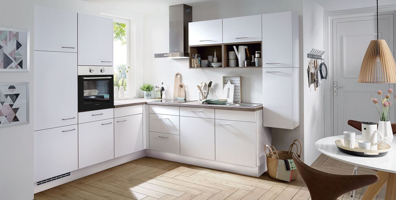 Inklusive Einbaubackofen Edelstahl Laurus LEB3 Energieeffizienzklasse A, Glaskeramik Kochfeld Laurus LCA600, Dunstesse Edelstahl Faber EASYPBXA60NG Energieeffizienzklasse C, Kühlschrank Laurus LKG88E Energieeffizienzklasse E, Einbauspüle Edelstahl Rodi Okio Line 85 Deep, Unterschrank mit Frontauszügen, Wandschränken mit Klappe, Schrankregalen, Einbauspüle Edelstahl.