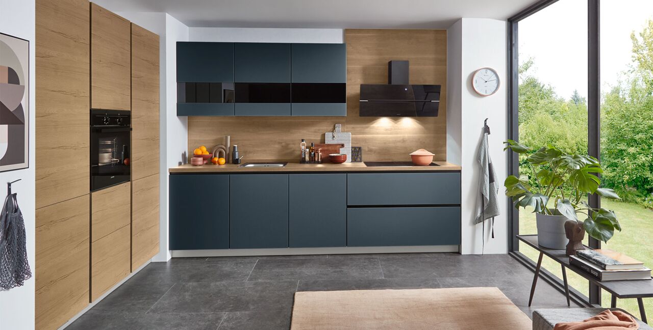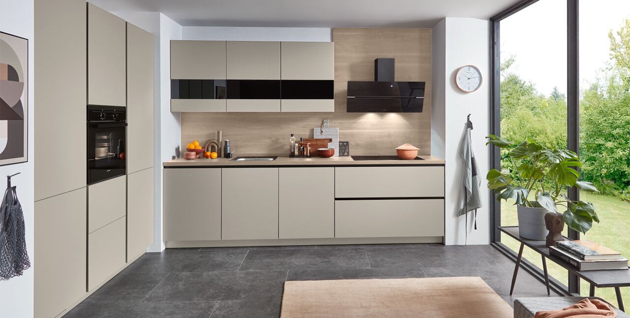 Inklusive Einbaubackofen schwarz Junker JF1300061 Energieeffizienzklasse A, Glaskeramik Kochfeld Junker JR36DT54, Designesse Edelstahl / Schwarzglas Elica WISE90BK Energieeffizienzklasse B, Kühlschrank Laurus LKG122E Energieeffizienzklasse E, Geschirrspüler vollintegriert Bosch SMV41D10EU Energieeffizienzklasse E, Einbauspüle Edelstahl Rodi NewManaus, XL-Schränken, Unterschrank mit Großraumauszügen, Wandschränken mit Segmentglastüren, LINE N.
