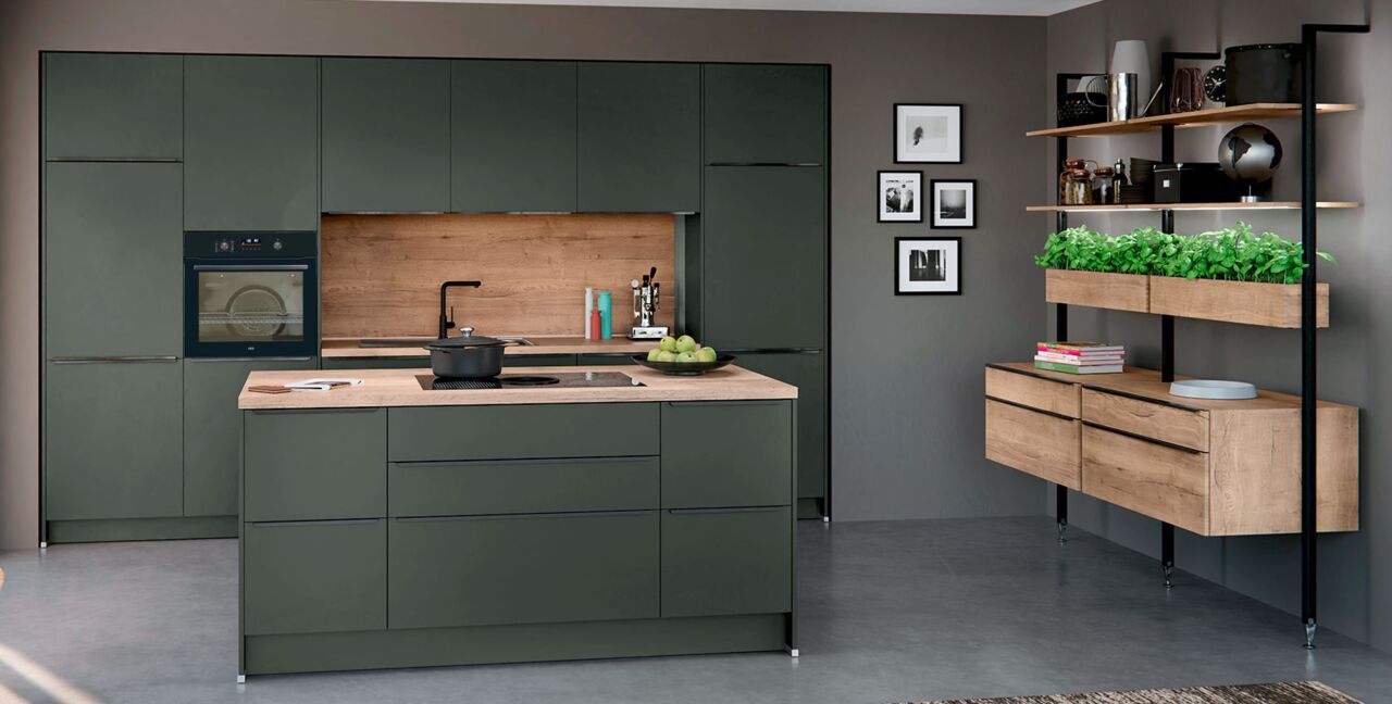 Inklusive Einbaubackofen AEG EB32B Energieeffizienzklasse A, Glaskeramik Kochfeld mit Induktion und Kochfeldabzug (Umluft) Bora GPNextE80N, Kühlschrank AEG OSK6I82EF Energieeffizienzklasse E, Geschirrspüler vollintegriert Bosch SMV41D10EU Energieeffizienzklasse E, Einbauspüle Edelstahl Rodi Okio Line 85 Deep, Stollenregalsystem, Unterschränken mit Großraumauszügen.