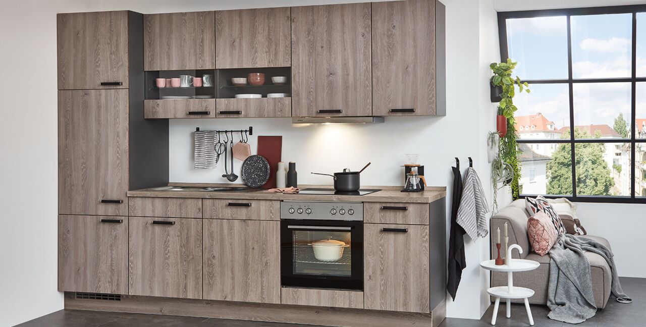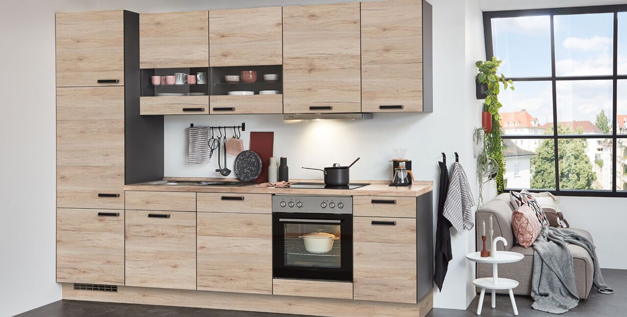 Inklusive Einbauherd Edelstahl Laurus LEH5 Energieeffizienzklasse A, Glaskeramik Kochfeld Laurus LCF600, Flachschirmhaube Elica ELITE 14 60-D Energieeffizienzklasse D, Kühlschrank Laurus LKS88E Energieeffizienzklasse E, Einbauspüle Edelstahl Rodi Okio Line 85 Deep, Wandschrank mit Segmentglastüren.